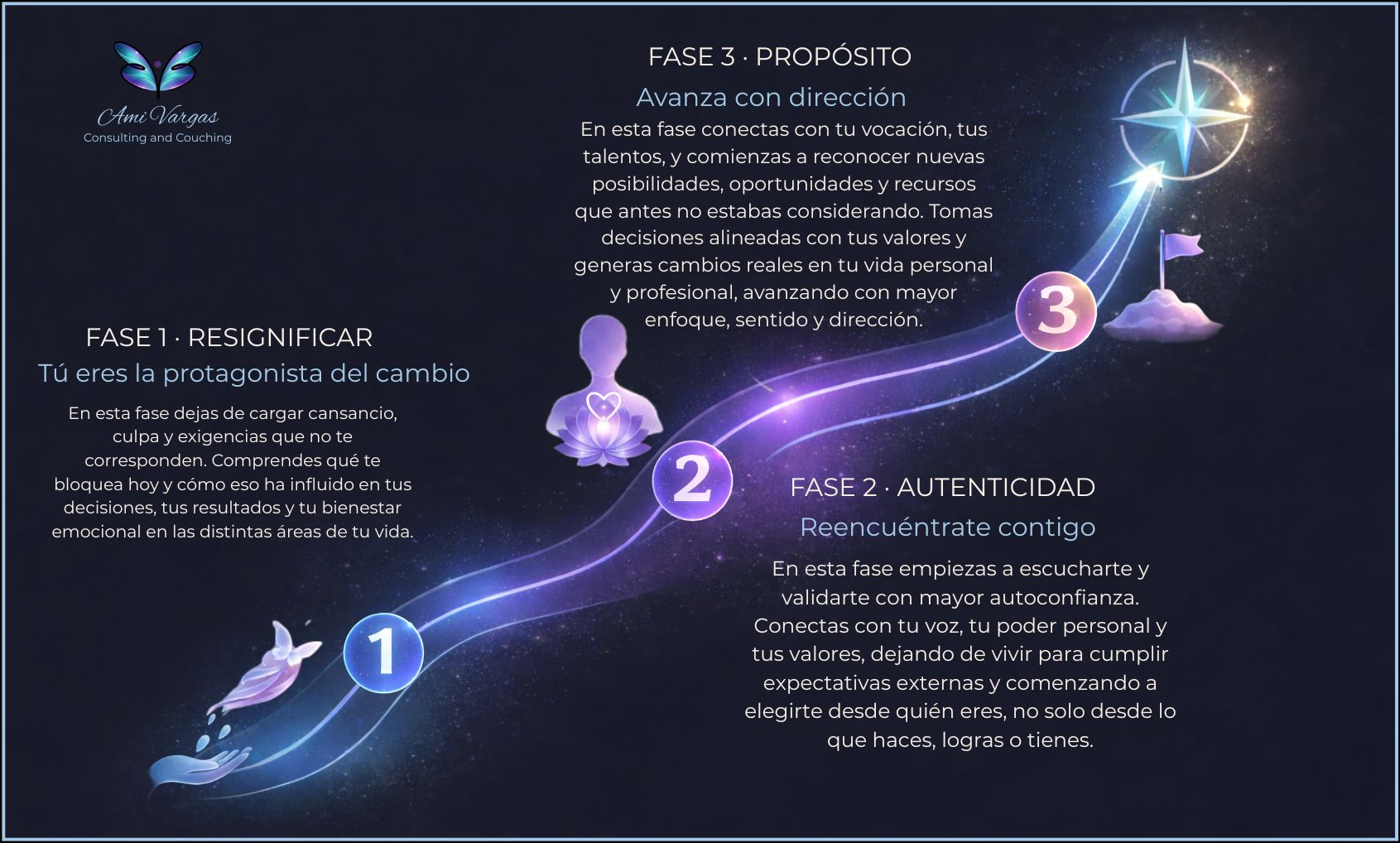 Es un proceso progresivo de resignificar, reconectar con tu autenticidad y dar dirección a tu propósito. Cada fase se construye sobre la anterior, permitiéndote avanzar con orden, profundidad y claridad, sin forzarte ni exigirte más de lo que hoy puedes sostener.